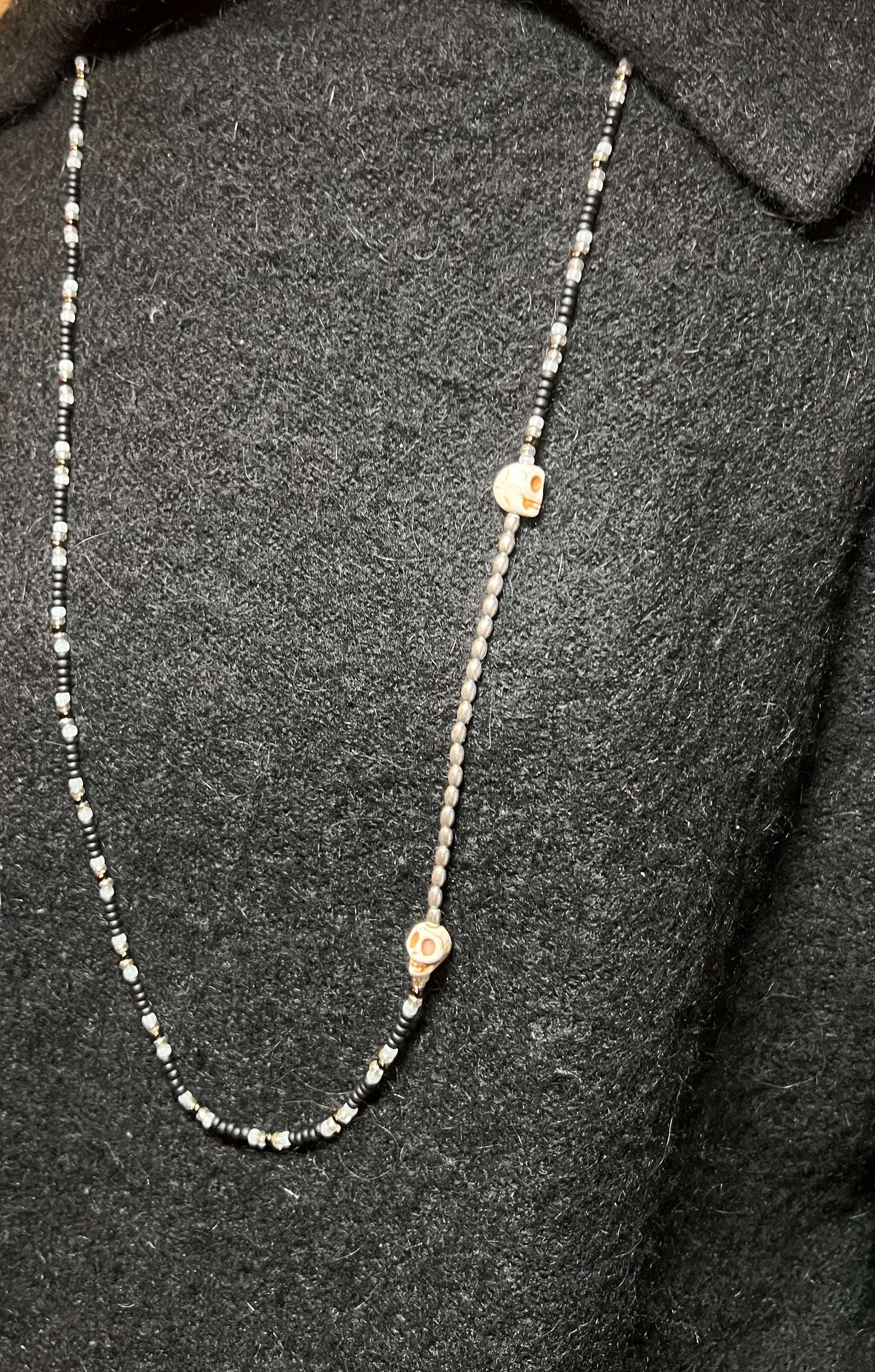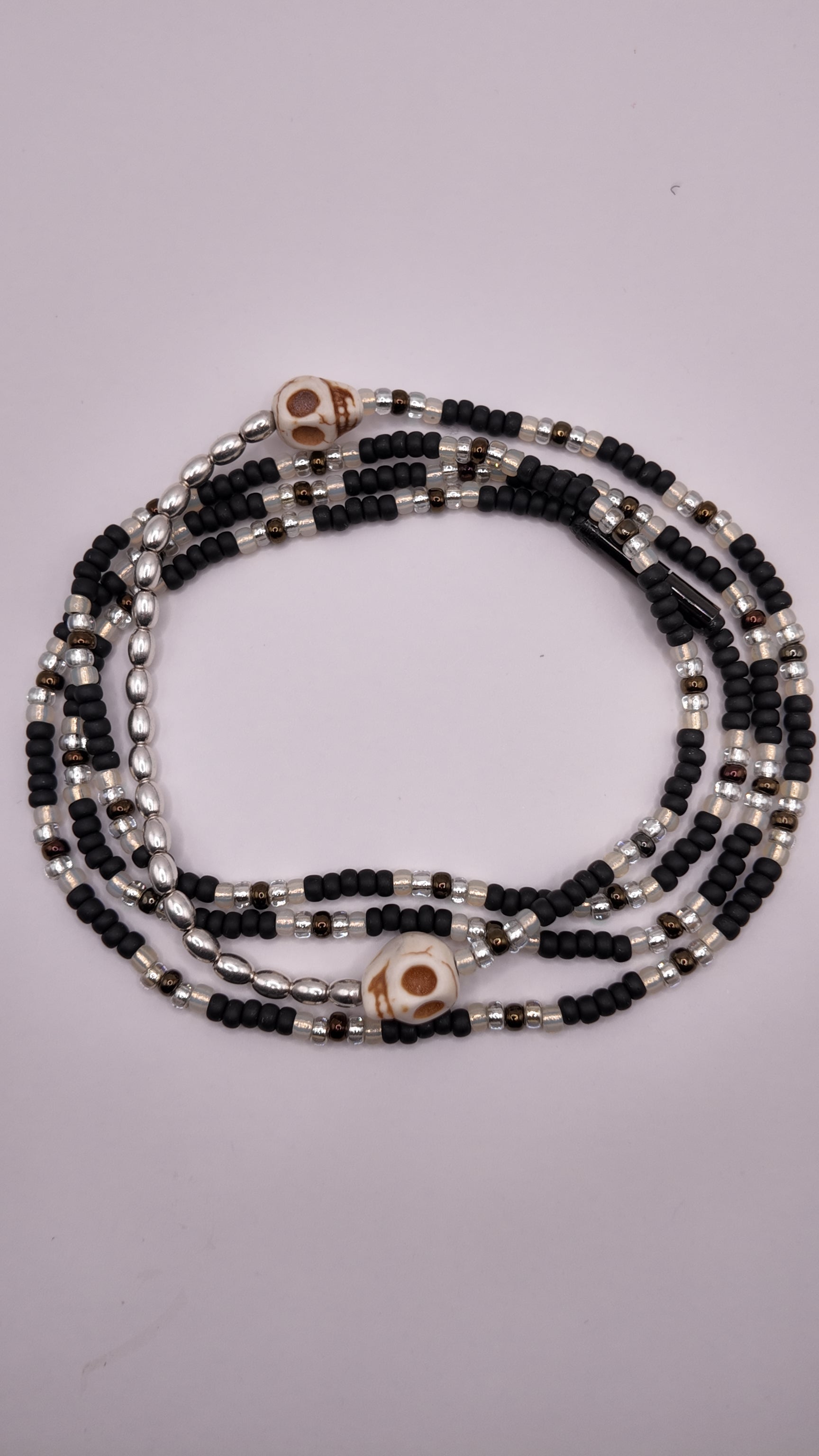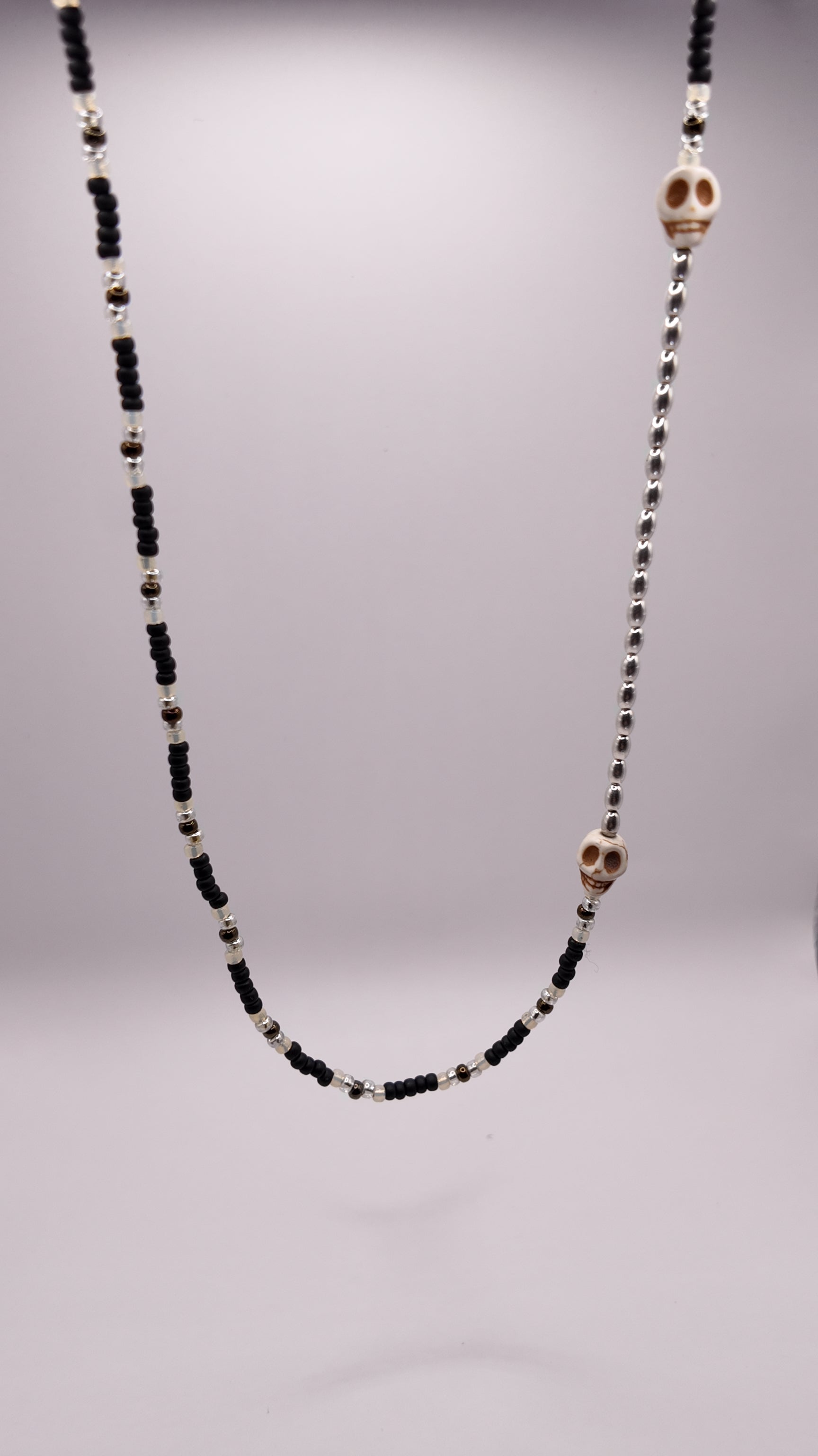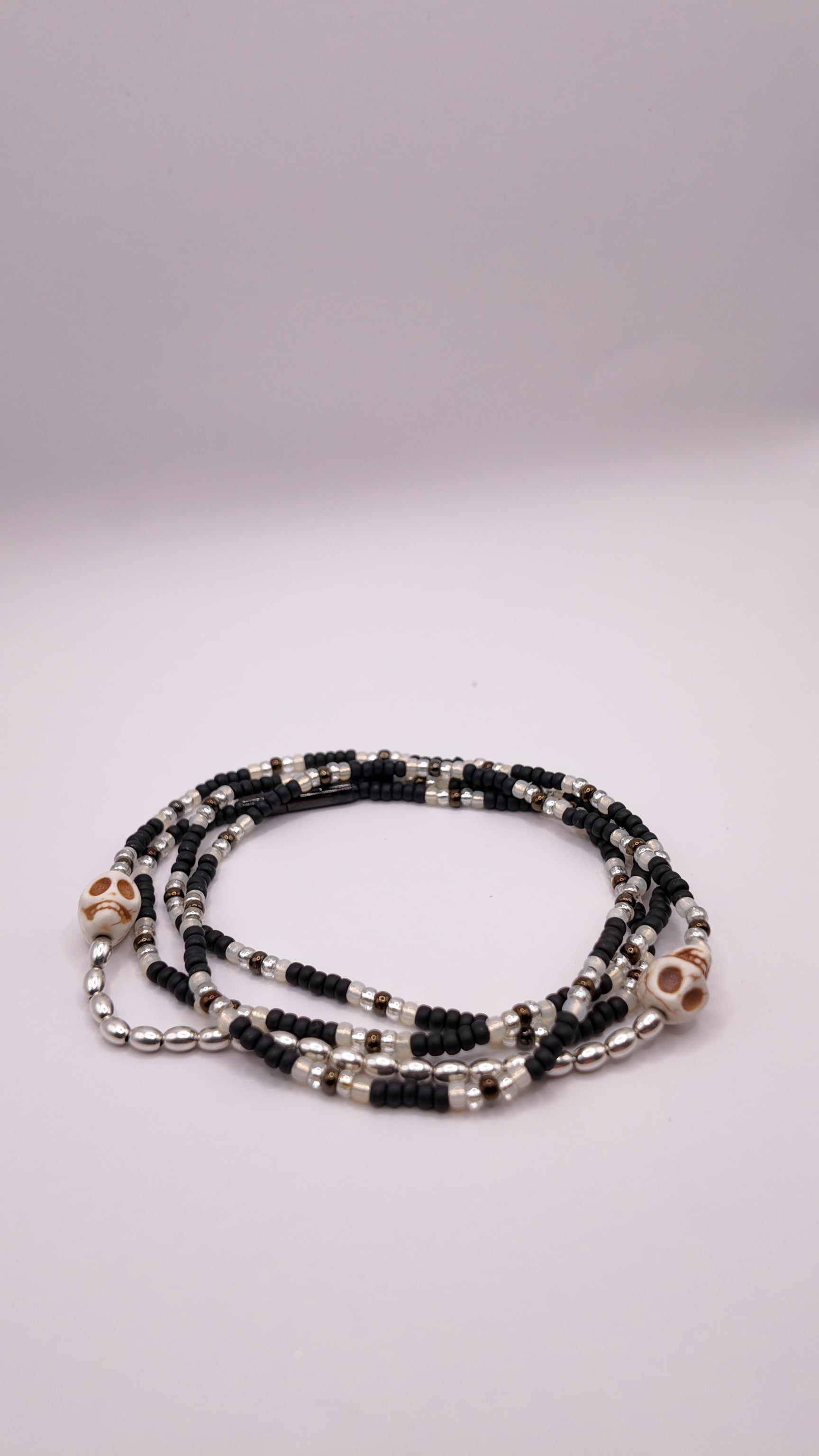 Palette claire et neutre, dominée par des perles ivoire et métalliques. Deux têtes de mort ton naturel encadrent les éléments en argent 925 pour un rendu épuré et élégant.